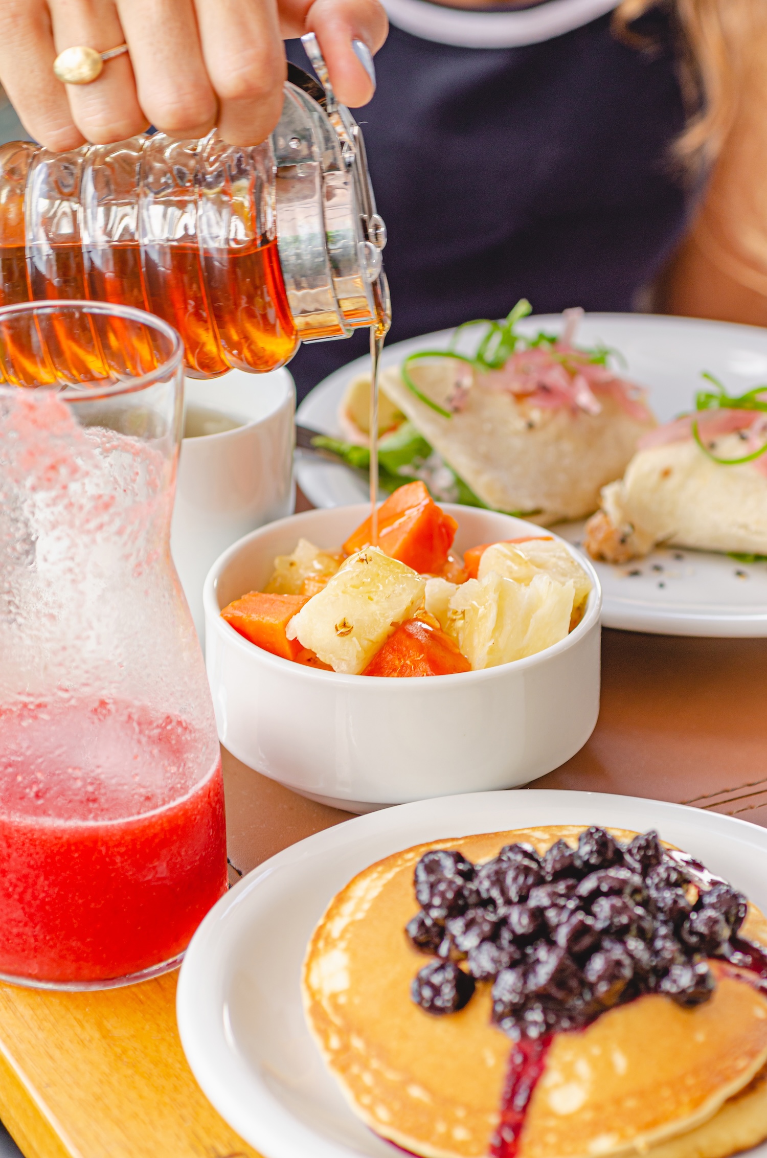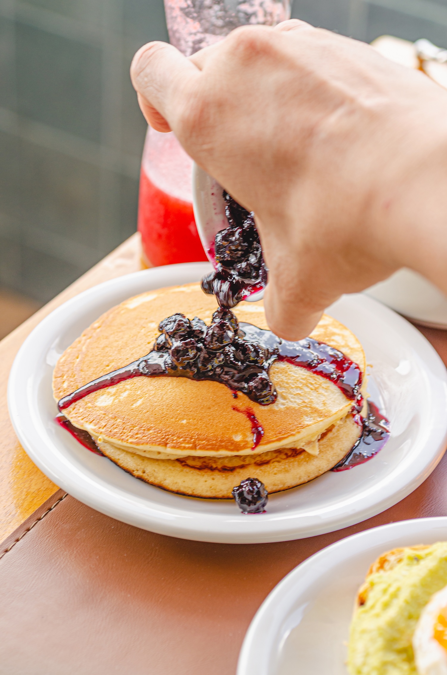American pancakes topped with blueberry sauce