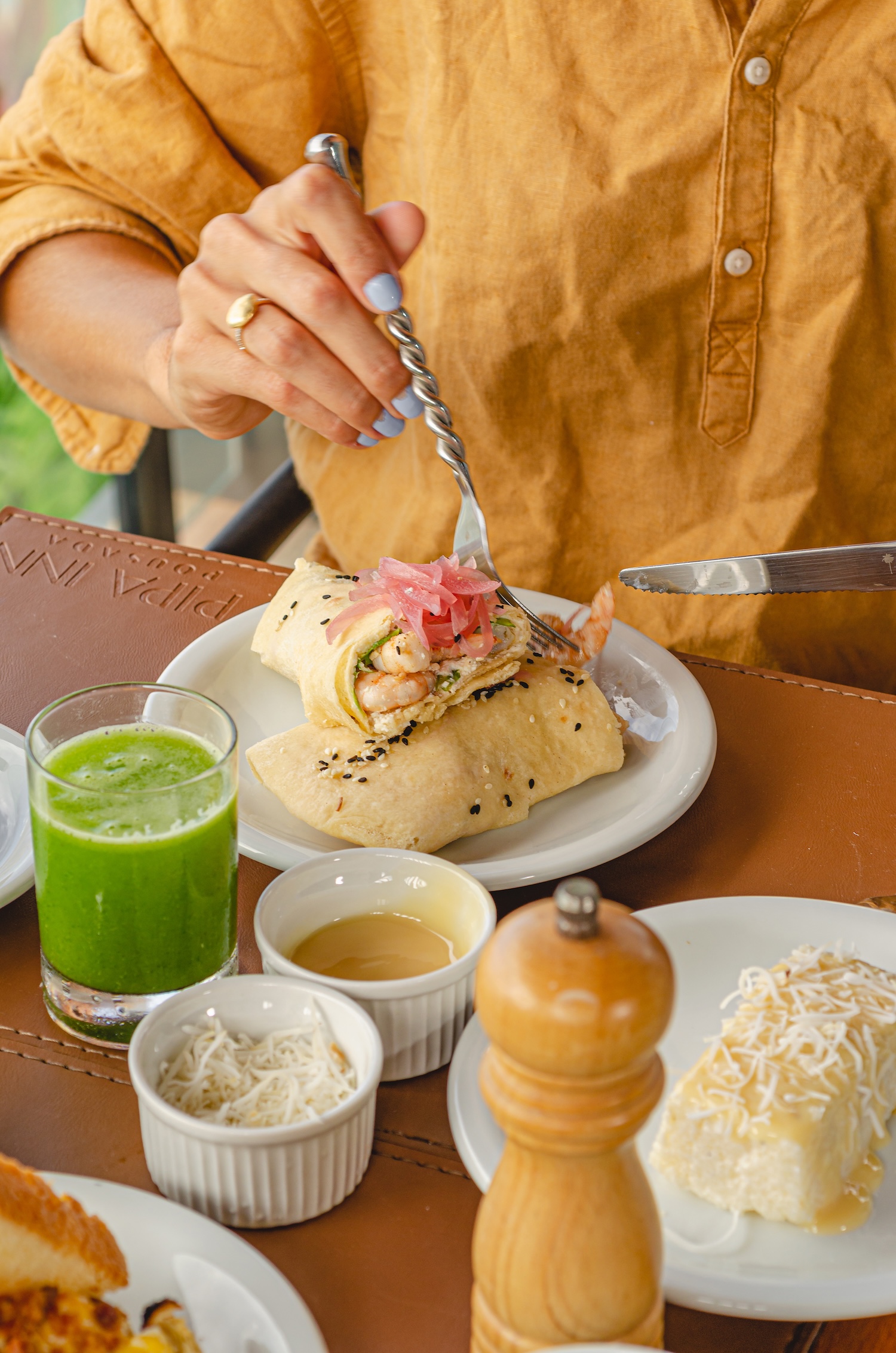 Tortilla stuffed with shrimp, house-made ricotta and lettuce, finished with pickled onion and sesame seeds