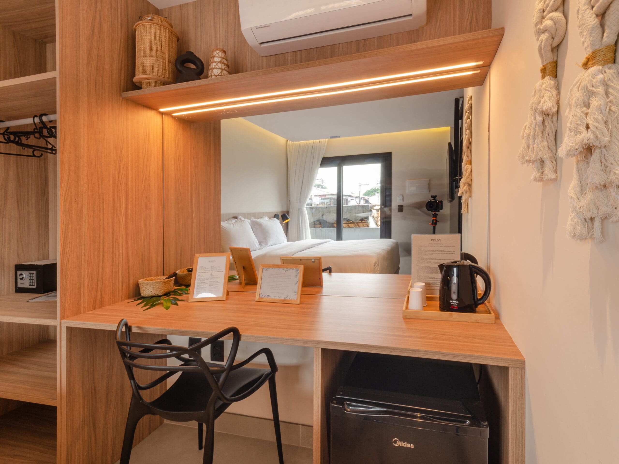 O quarto ainda possui guarda roupa, frigobar, chaleira elétrica, cofre e tomadas nas cabeceiras de cama.